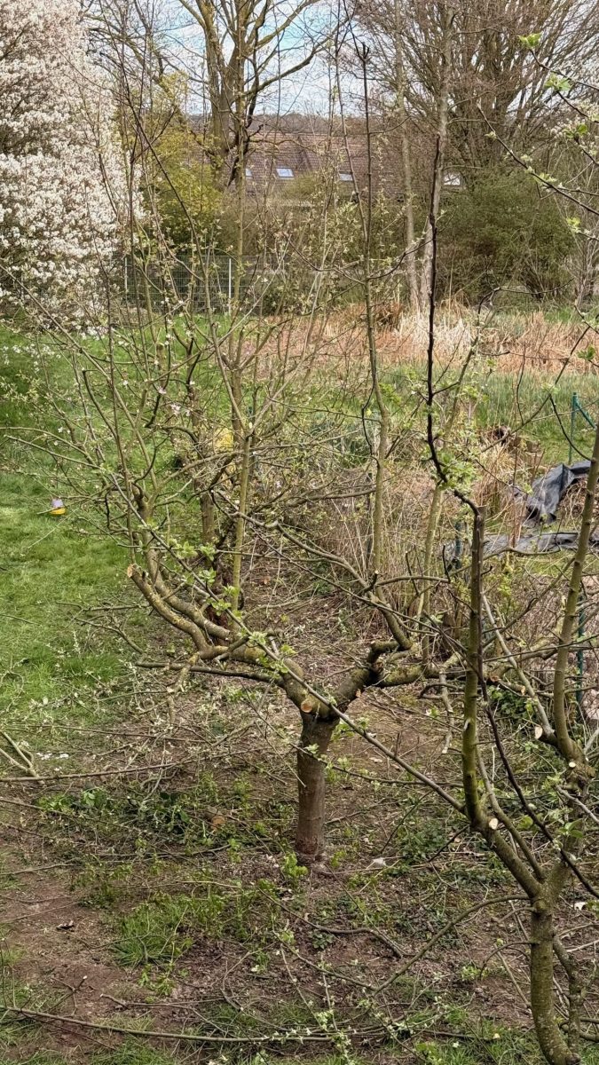 Die Pflege ist nicht abgeschlossen: Die Apfelbäume werden im Sommer noch einmal nachgeschnitten, um junge Triebe zu formen und störende Seitentriebe zu entfernen. So sichern wir langfristig die Vitalität der Bäume und eine gute Ernte.