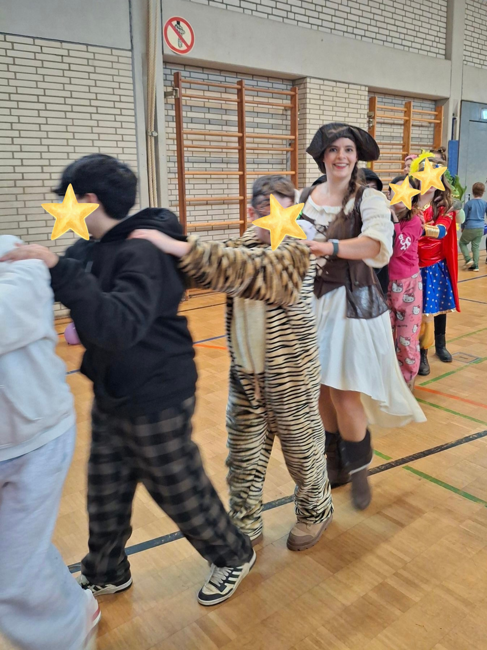 Im zweiten Block versammelten sich alle Klassen der Primarstufe in der Turnhalle, um gemeinsam weiterzufeiern. Zu schwungvoller Karnevalsmusik wurde getanzt und an verschiedenen Spielstationen teilgenommen. Besonders beliebt waren der Eierlauf, das Möhrenziehen und das Luftballonhochhalten, bei denen Geschicklichkeit und Teamgeist gefragt waren. Jede Klasse wurde einzeln für ihre Kostüme gewürdigt und anschließend unter lautem „Helau“-Rufen mit Süßigkeiten aus der Turnhalle verabschiedet.