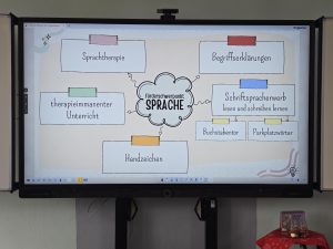 In einem Klassenraum informierten Lehrkräfte über den Förderschwerpunkt Sprache und luden gleichzeitig dazu ein, verschiedene digitale Medien und Tools auszuprobieren, die im Unterricht eingesetzt werden.